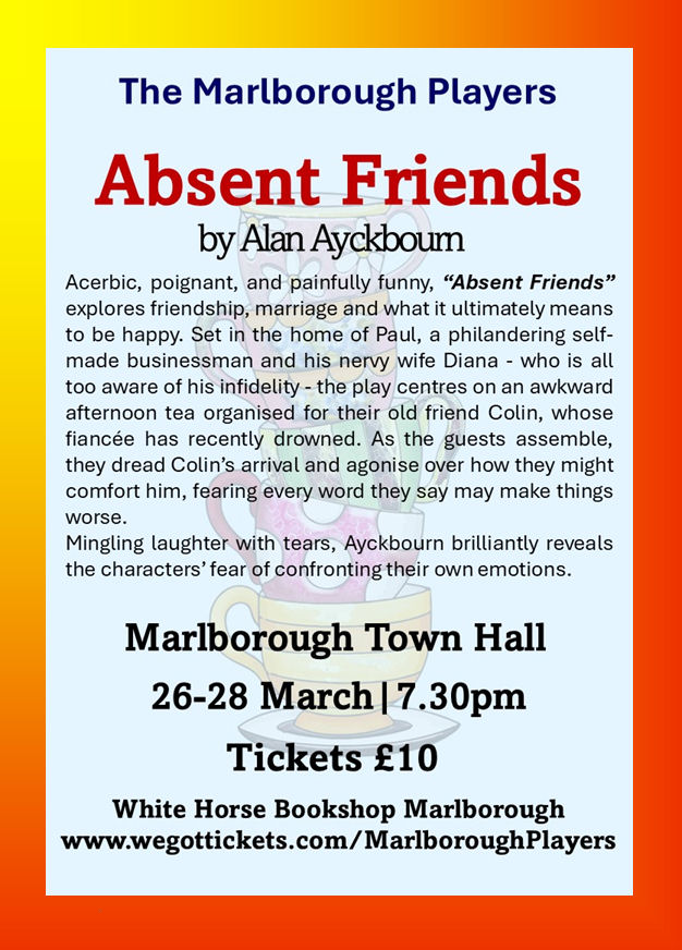 TICKETS HAVE NOW GONE ON SALE for the MARLBOROUGH PLAYERS’ production of ALAN AYCKBOURN’S ‘ABSENT FRIENDS’! With a cast of six and directed by Rhian Vaughan-Webb, this acerbic, poignant & painfully funny play is being staged at Marlborough Town Hall from Thursday 26th to Saturday 28th March (7.30pm – doors open at 6.45pm).
